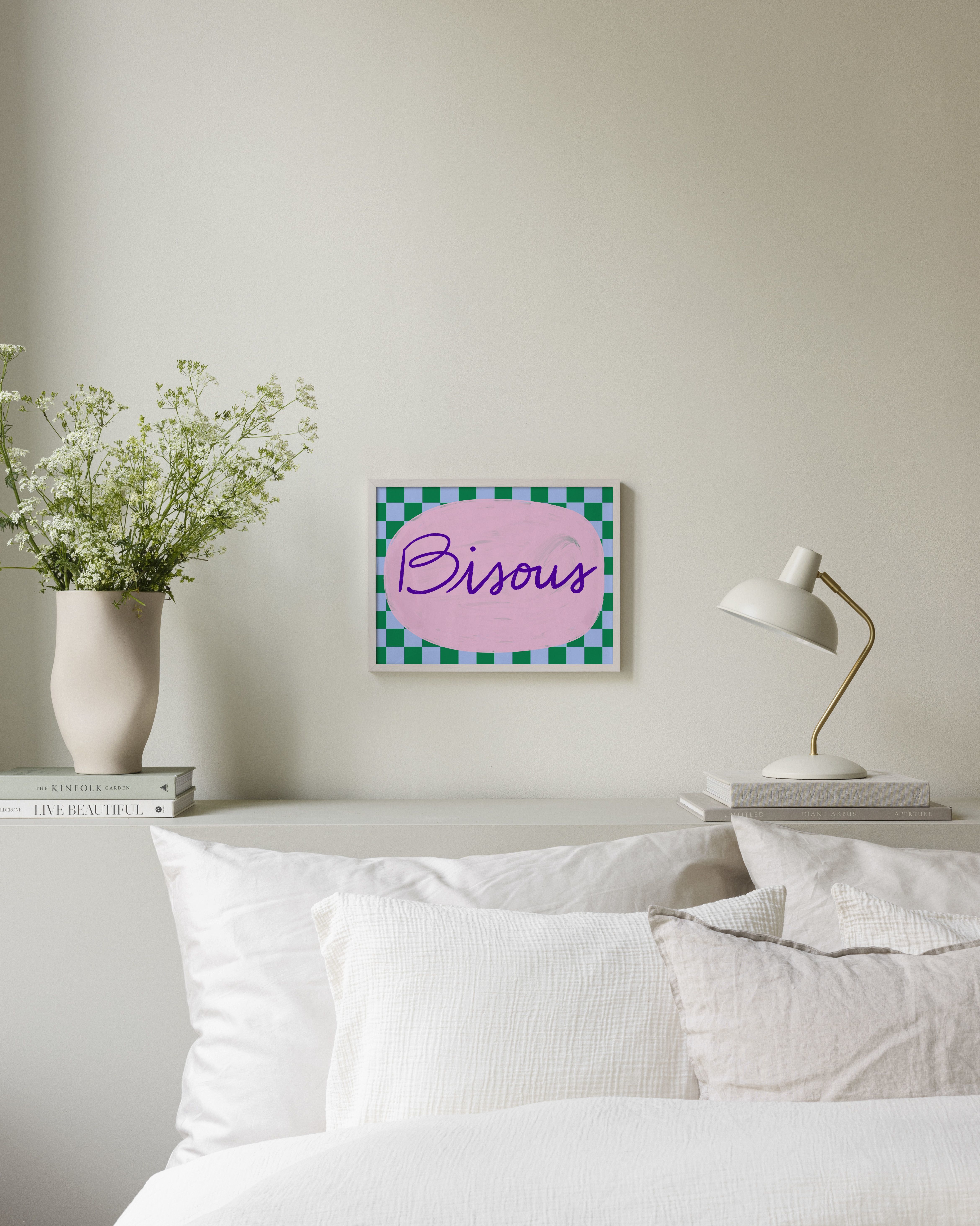 Ein rosa Oval mit "Bisous" in lila Schreibschrift auf einem grün-blauen Schachbrettmuster-Hintergrund. Süßes französisch inspiriertes Poster mit gemaltem Look.