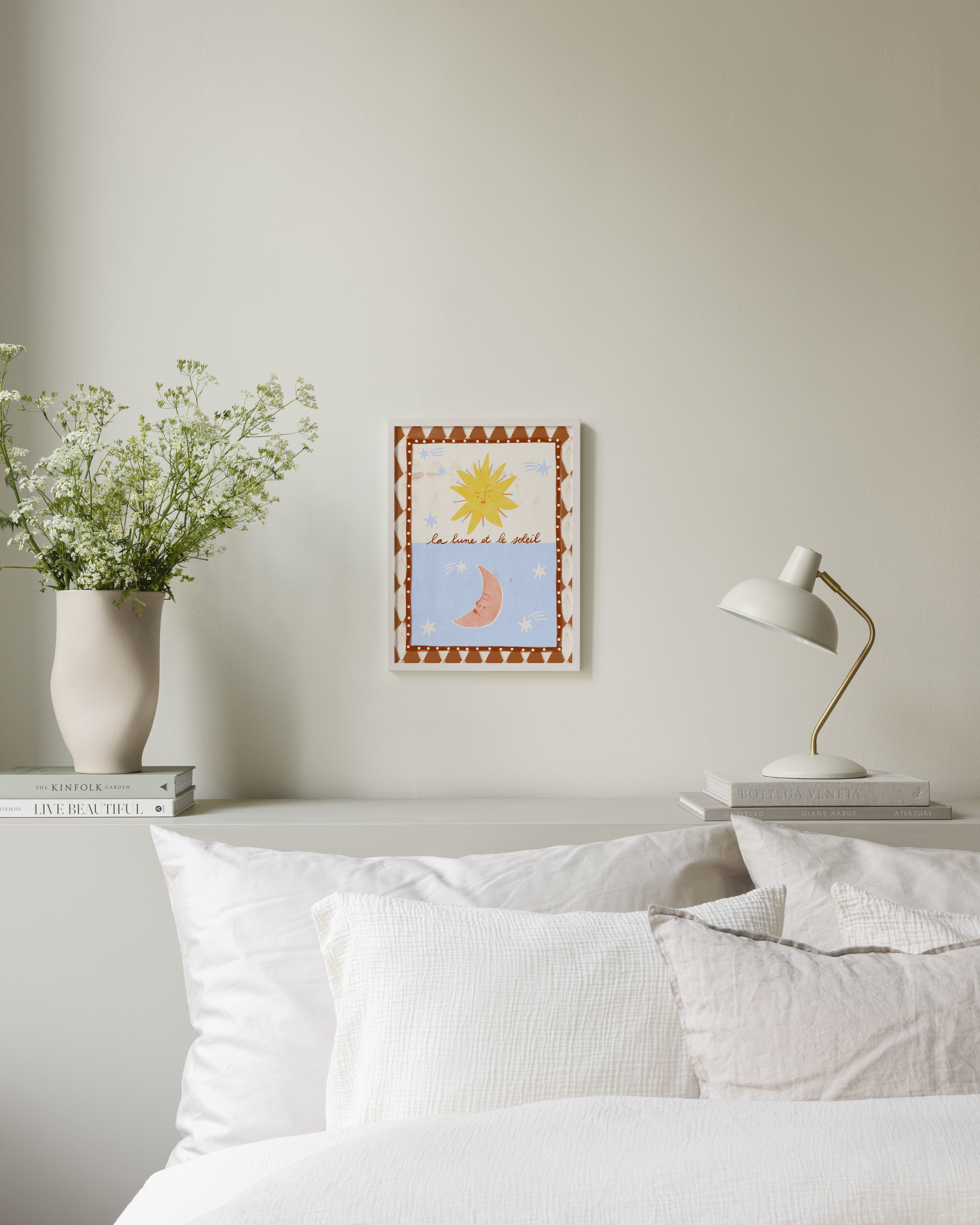 Ab 10,50 €Ein farbenfrohes Poster mit einer gelben Sonne und einem rosa Mond mit Gesichtern, umgeben von blauen und weißen Sternen. Der Text "la lune et le soleil" erscheint in der Mitte auf einem cremefarbenen und blauen Hintergrund.