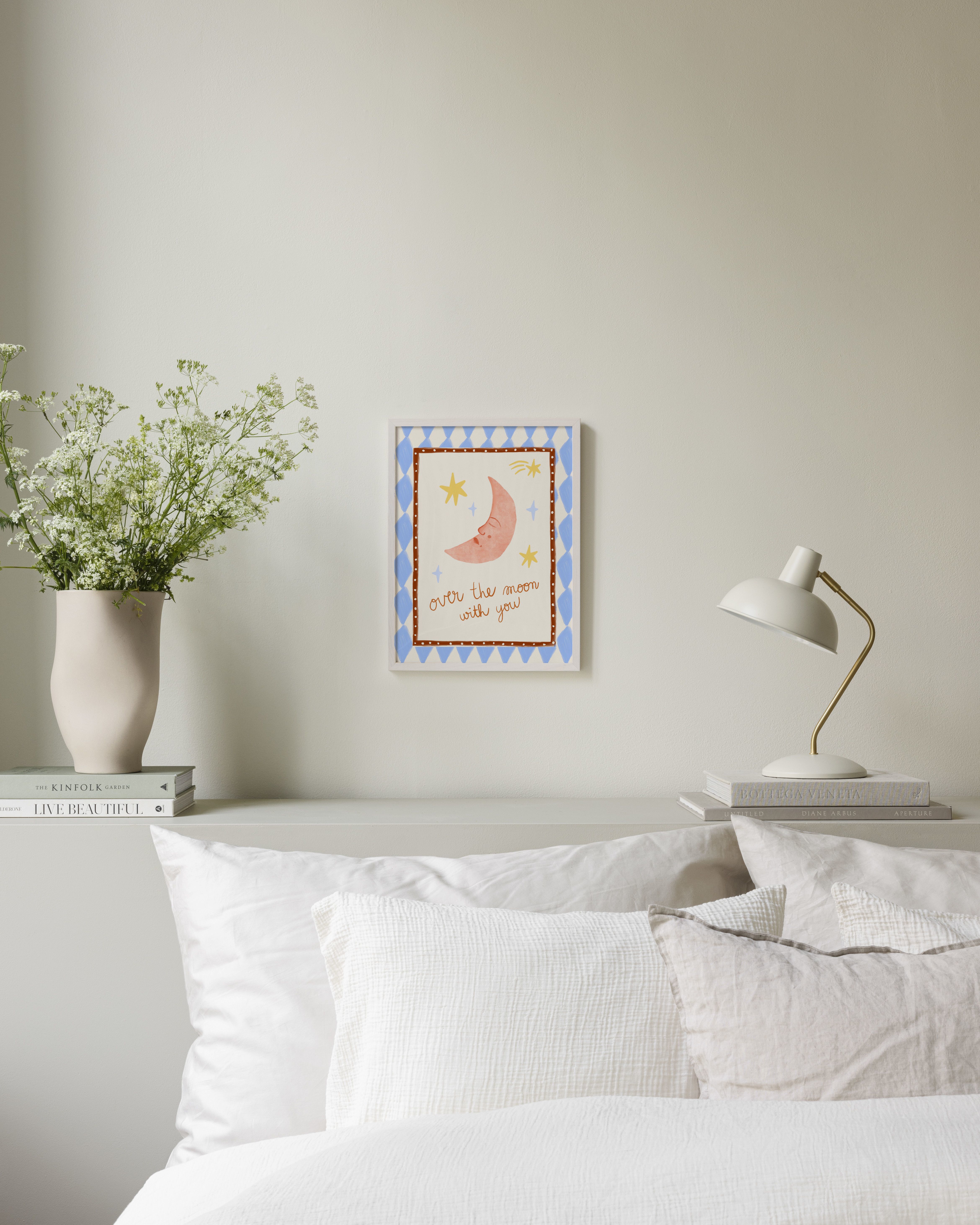 Ein süßer pinker Mond mit einem Gesicht, umgeben von gelben Sternen und blauen Diamanten. Dieses schöne Poster zeigt den Text "over the moon with you" in roten Buchstaben.